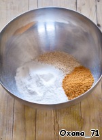 В миске смешать 50 г молотой смеси миндаль-овсяные хлопья, 80 г рисовой муки, 2 ст. ложки коричневого сахара. -