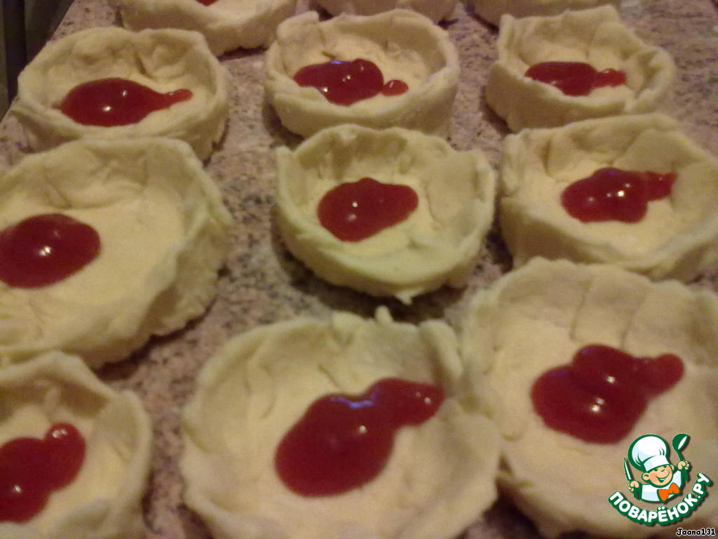 Тесто раскатать в пласт толщиной 0,5 см. Нарезать на квадраты 6 на 6 см. Из квадратов, защипывая края сделать корзинки с бортиком примерно в 1 см. Мне понравилось их лепить. В каждую налить кетчуп с крупную горошину. Кетчуп размазать ложкой по дну корзинок.