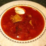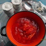 Вот такой красивый цвет у моего борща был вчера вечером. Потом стемнело, пришли гости... и все, что описано выше, съели... Так что, достойное фото сделать не удалось...