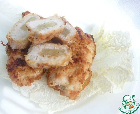 Каждый кусочек ананаса обернула по спирали отбитой полоской куриного филе...