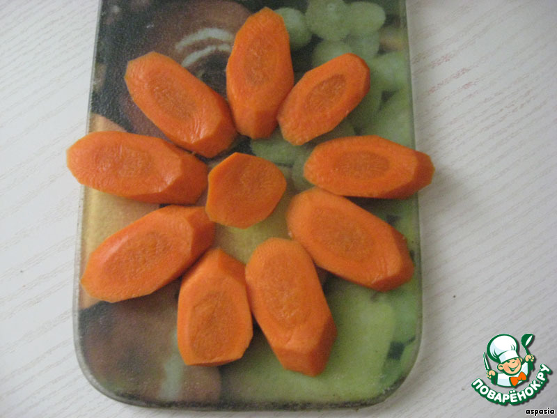 Тем временем очистила морковь и нарезала ее вот так - почему-то солнышка захотелось. Затем отправила ее на сковородку с маслом. Затем, в кастрюлю с рагу.