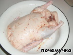 Утку моем под холодной водой, вытираем насухо. Смазываем 1 ст. л. растительного масла, солим и перчим внутри и снаружи, натираем второй половиной пряной смеси.