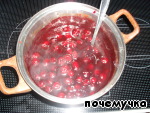 Пока печется утка, готовим соус. Для этого кладем в ковшик вишню, сахар, корицу и бадьян. Заливаем вином и ставим на огонь. Доводим до кипения и варим, пока соки в ковшике не приобретут консистенцию сиропа, около 30 минут.