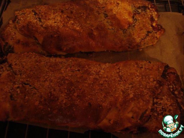 Третий пласт смазываем растопленным маслом. Посыпаем орехами.