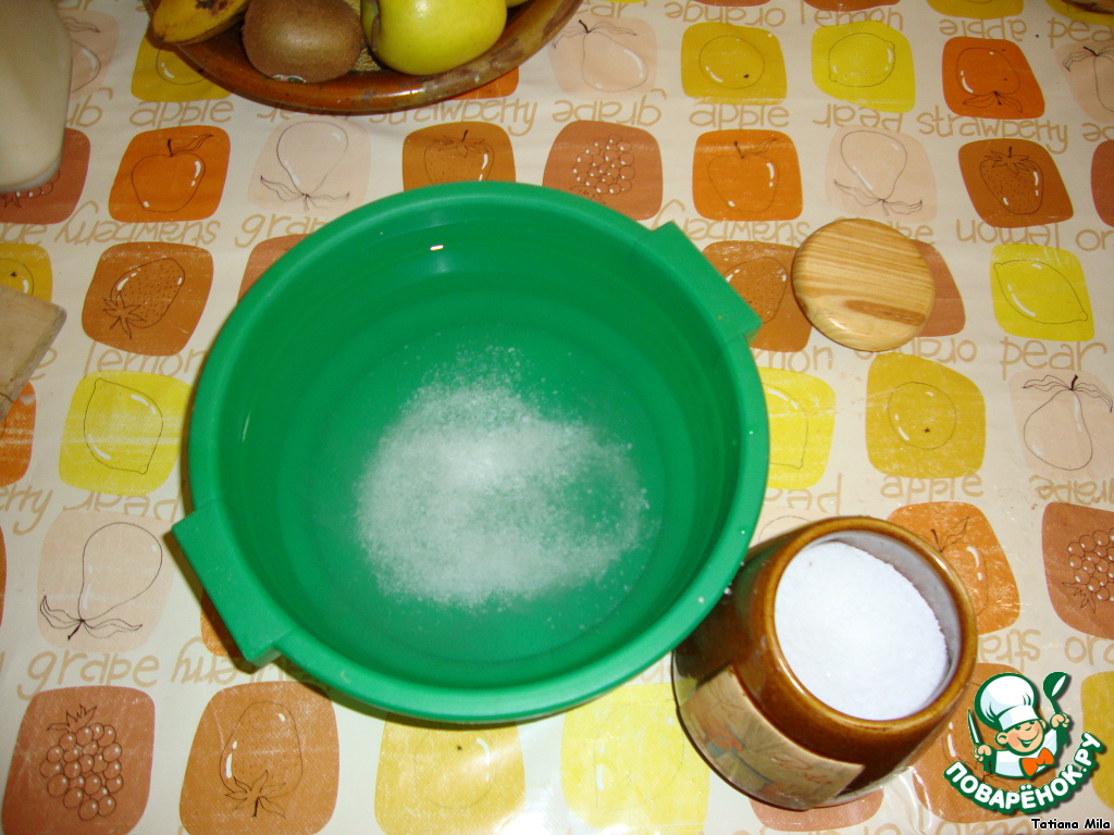 Значит так, в глубокую плошку наливаем воду и солим ее по вкусу. -