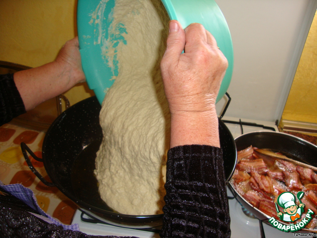 В глубокой сковороде разогреваем оливковое масло. И выливаем туда тесто.