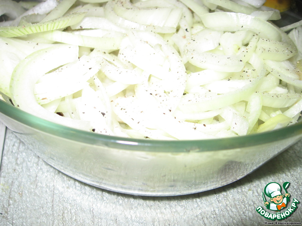 Шинкуем полукольцами лук и укладываем на почки. Лука кажется очень много, но после запекания он осядет. Можно еще немного присолить.