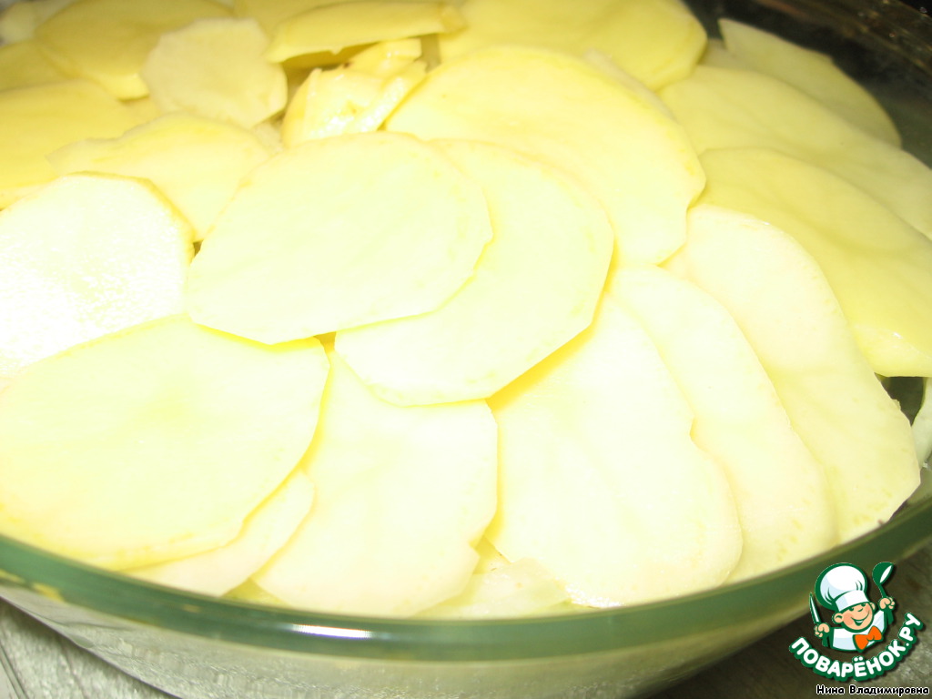 Тонкими пластинками режем картофель и укладываем на лук. У меня, к сожалению, картофеля было очень мало.