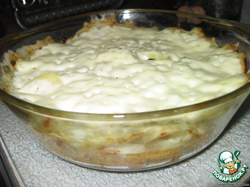 Покрываем слоем сметаны или майонеза. Закрываем форму крышкой и ставим в нагретую до 180 градусов духовку на 60-100 минут.