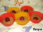 Выпекать при температуре 170 градусов 30 минут, ориентируйтесь на свою духовку. Внутри кексы заполнены начинкой из ириски и вишни, ирис больше не застывает.