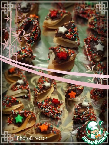 Выложить тесто на противень на небольшом расстоянии друг от друга и выпекать минут 10 -15, пока края печенья не станут слегка золотистыми. Не пересушите! Снять лопаткой готовое печенье, завернуть в него предсказание и сложить его пополам через край стакана. Если горячо, работайте в перчатках! Чтобы печенья сохранили свою форму, сложить их в стеклянную баночку до полного остывания. Приготовить на водяной банке из 100 гр. шоколада и 100 гр. жирных сливок шоколадную глазурь. Покрыть готовое печенье глазурью, посыпать разноцветной присыпкой.