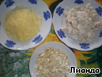 Мясо нарезать мелкими кусочками, сыр натереть.