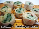 Разрезать рулеты на спиральки и закрепить зубочисткой.