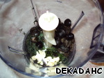 Пока рыбка маринуется, готовим нашу "шубку" для неё. В блендер выкладываем зелень, немного нарезанные маслины, чеснок и оставшиеся 3 ст. ложки масла. Всё хорошо измельчаем.
