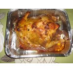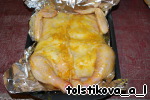 На противень для запекания кладем фольгу, смазываем маслом, укладываем курочку и закрываем фольгой. Ставим в предварительно нагретую духовку до 180 градусов на 1 час. За 15 минут до готовности достать курочку из духовки и снять фольгу для зарумянивания корочки.