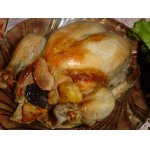 Это курочка не простая, она без костей, фаршированная куриным фаршем с морковкой по-корейски, фисташками и черносливом.