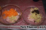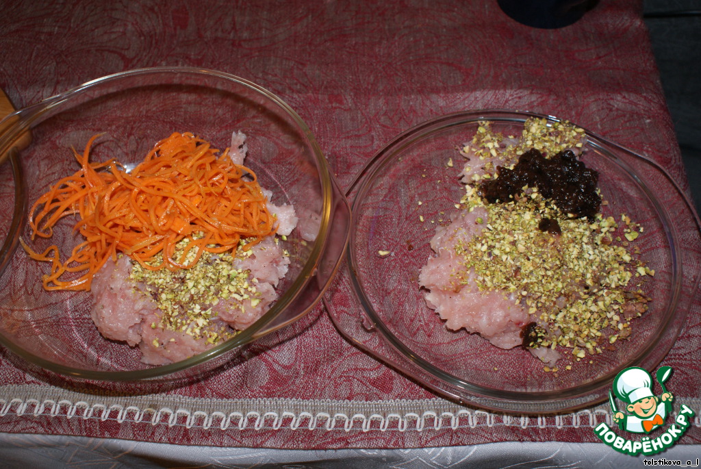 Делим фарш на две части. В одну часть добавляем 1/2 массы фисташек и морковку по-корейски, а во вторую часть фарша - измельченный чернослив и оставшиеся фисташки.