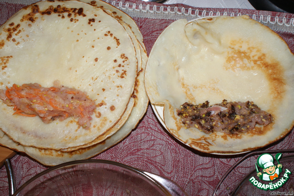 На блинчики выкладываем начинку и заворачиваем в трубочку.