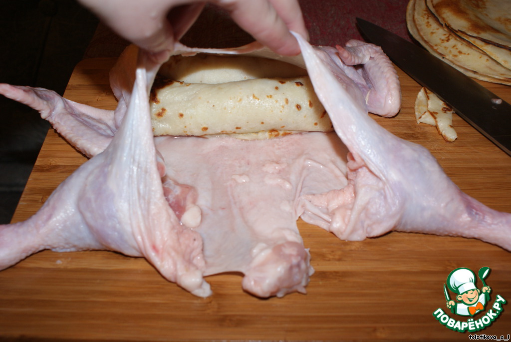 Начинаем фаршировать нашу курочку. Блинчики я выкладывала в шахматном порядке - так в разрезе красивее получается.