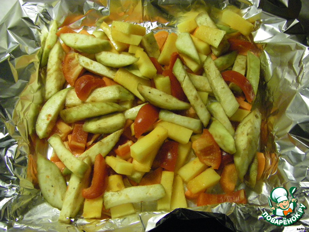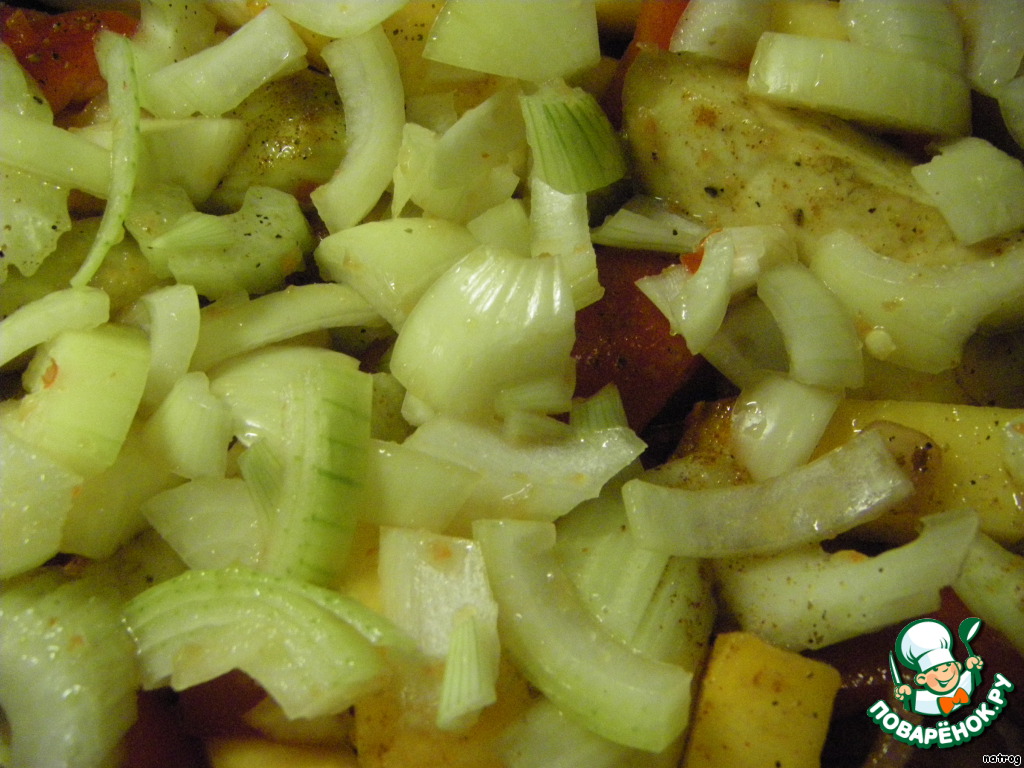 1. Режем тыкву, баклажан, черешковый сельдерей и перец крупными брусками, и слегка маринуем в рассоле от домашних консервированных огурчиков с добавлением чеснока и всяких приправ. Для любителей остренького острого перчика добавить не забудьте. За неимением рассола, можно сделать самим легкий маринад с лимонным соком или яблочным (у меня даже остаток кислого компота туда идет). В общем, что дома найдется. А если это делать лениво, то просто солим, перчим, добавляем любимые приправы, пару зубчиков чеснока, выжатого через чеснокодавку. Перемешиваем и даем постоять пока готовим остальное.