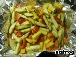 5. Все это опять сбрызгиваем маслом. Подлить просто воды или того маринада, в котором мариновали овощи, пойдет и томатный сок, но слегка разбавленный водой, в общем можно проявить свою фантазию, заодно и ревизию всяким остаткам сделать (например, опять таки же все то, что я советовала в маринад, вплоть до какой-то части апельсинового сока. Кетчуп не советую, уж много там всякого крахмала, после тепловой обработки остается один ПШИК).