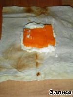 Лаваш нарезаем квадратами, в центр выкладываем творожную массу, на нее - тыкву и сверху закрываем творожной массой.