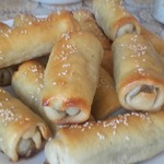 Закручиваем и выкладываем на противень. Никакие края защипывать не надо, просто швом кладем вниз.