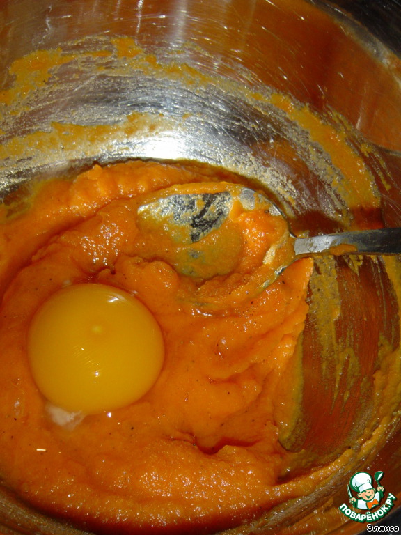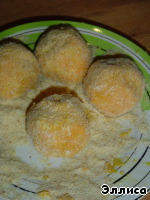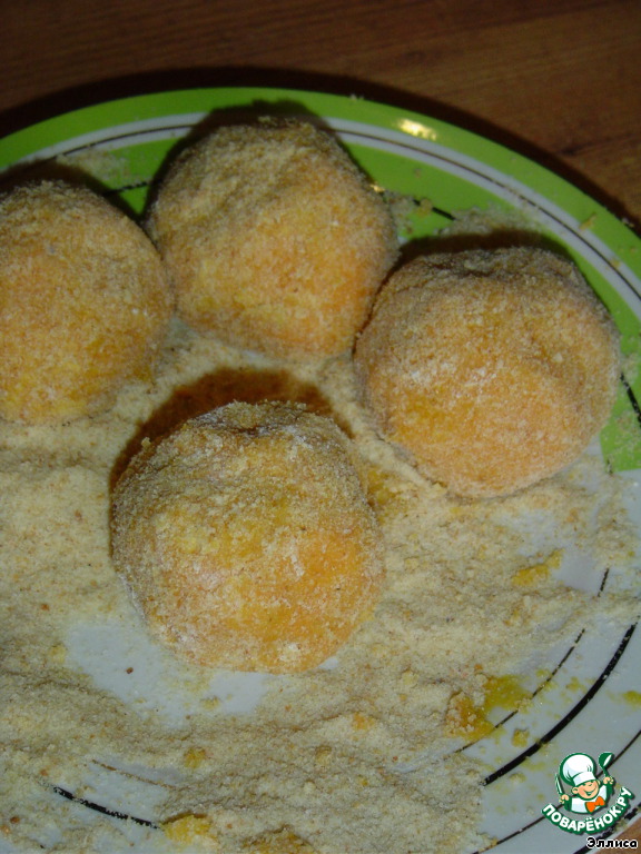 Из тыквенной массы формируем шарики, обваливаем их в муке, затем в взбитом яйце и в панировочных сухарях. Обжариваем их на оливковом масле.