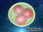 Помидоры надрезаем у основания крестом и заливаем кипятком. Через 1 минуту вынуть, залить холодной водой и затем очистить кожицу.