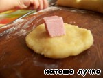 Добавить сыр и вымесить тесто, немного подсыпая муки. Оно получается очень мягким. Разделяем тесто на кусочки, кладём в середину ветчину (буженину).