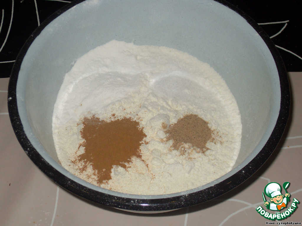 В отдельную посуду просеять муку с разрыхлителем, добавить соль, мускатный орех, корицу, перемешать. |