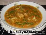 3-4 зубчика чеснока очистить, мелко нарезать (ни в коем случае не давить), опустить в готовый суп. Огонь выключить и настаивать суп под крышкой 10 минут. В готовый суп добавить лимонный сок по вкусу.
