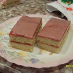 Собственно к чему я это: получилось очень вкусно и очень клубнично. Очень сладко, поэтому много наверно не съешь -- возможно в пропитку надо класть меньше сахара или вообще не класть. Или варенье варьировать, не знаю. Очень липко, потому что варенье во все стороны. И как не странно, очень красиво именно из-за жесткой помадки: получились розовые куски помадки хаотично распределенные по красному варенью выглядели весьма живописно.