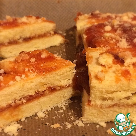 Выпеченный корж горячим смазываем тонким слоем густого повидла (у меня яблочное), разрезаем пласт на две половины и аккуратно складываем одну часть на другую так, чтобы на верхнем пласте повидло было сверху...
