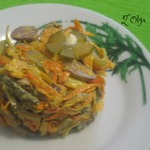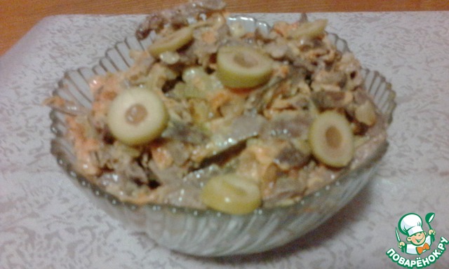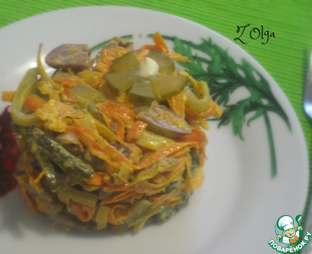 [+5]Каюсь, пришлось сделать вынужденное отступление (обычно при первом приготовлении строго придерживаюсь рецептуры автора): дома не оказалось маринованного огурчика, пришлось порезать зеленые оливки.
