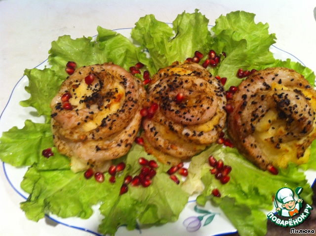 • Выложить на салат розочку. Можно украсить зернами граната. Это оооочень вкусно, ароматно, довольно просто и красиво!