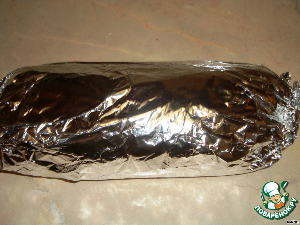 Завернуть рулет в фольгу и отправить в духовку на 1-1,5 часа (при 200 град.)
