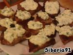 Выкладываем мясо на плоскую тарелку. Затем понемногу на каждый кусочек маленькой ложечкой кладем массу. Блюдо готово!