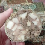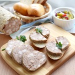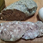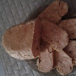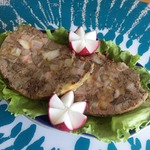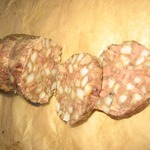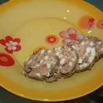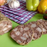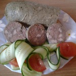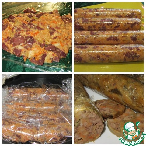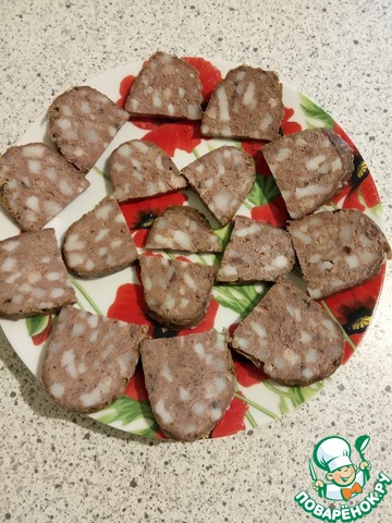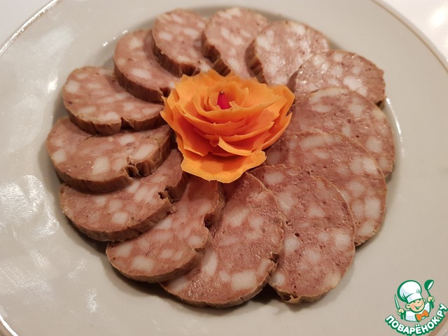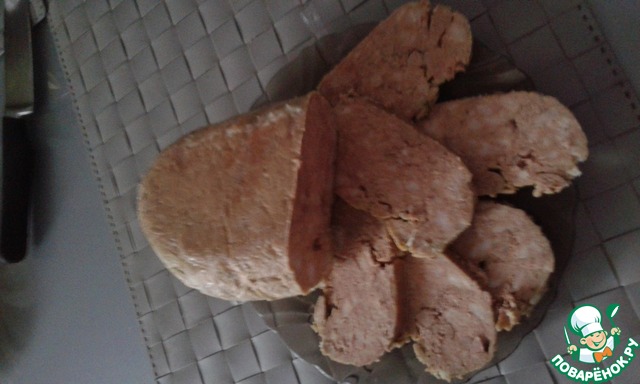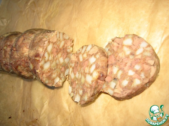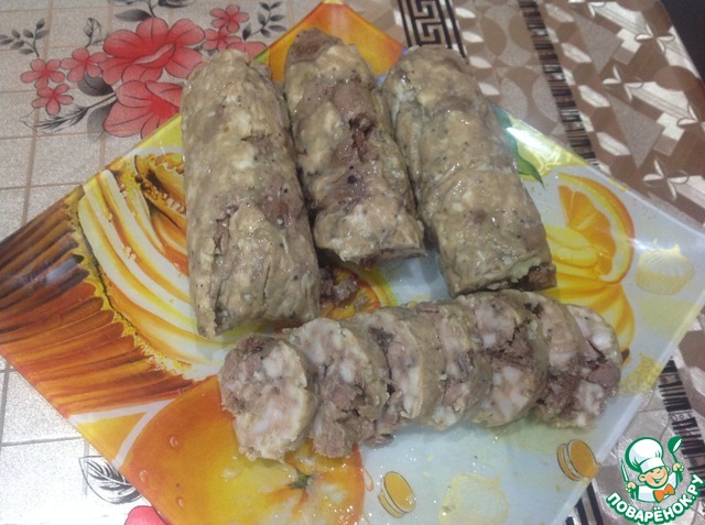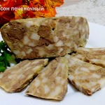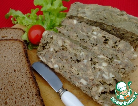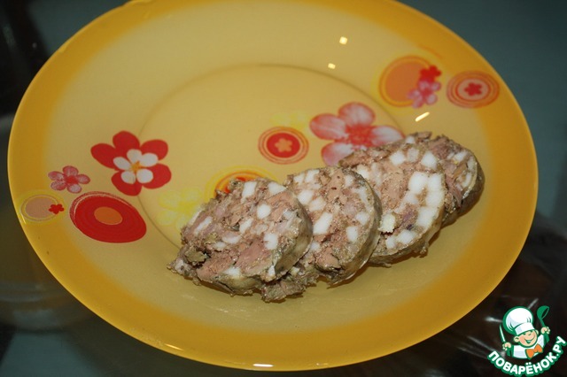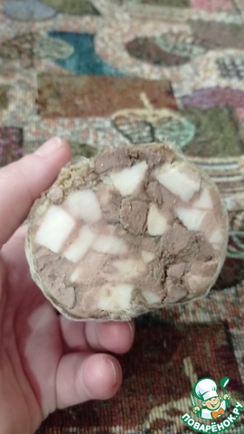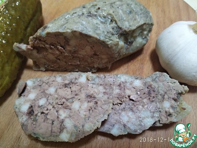 Начну с того, что расскажу о своих впечатлениях. Сначала были у меня сомнения и даже, когда было уже все готово, оставалось только остудить, сомнения только выросли, но, как только попробовала, все испарились) Очень вкусное блюдо, что-то похожее на деревенский паштет. Нежный, вкусный, не разваливается, режется, как колбаса, и держит форму. Сразу хочу сказать, что я брала не сало (как написано в рецепте), а грудинку с мясными прожилками.
