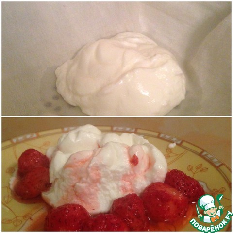 Чтобы получить густой йогурт, сыворотку нужно просто отсадить, так же, как отсаживаем сметану для крема. Для этого дуршлаг застелите плотной тканью, я использую нетканые чудо-салфетки,