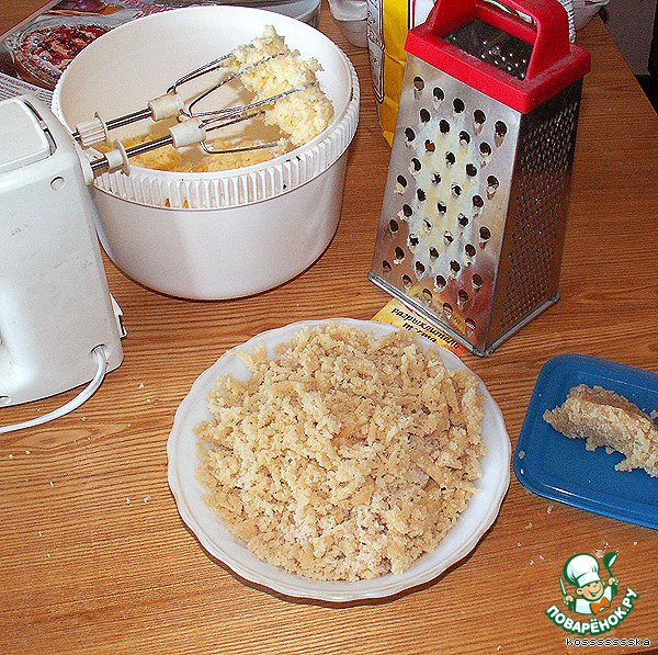 Натираем марципан на крупной терке. Если марципан слишком эластичный (свой), можно часть просто раскрошить в пальцах.