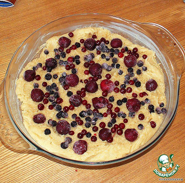 Берем ягоды (можно мороженные), раскладываем в произвольном порядке прямо поверх теста.