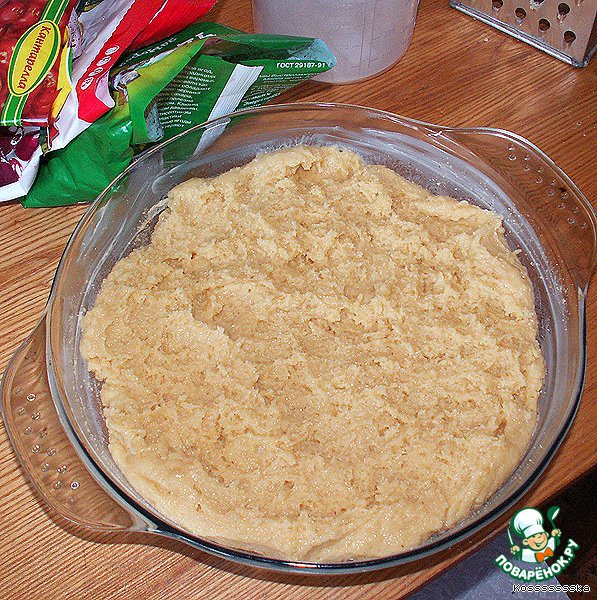 Нагреваем духовку до 175 градусов. Форму (24-26 см) смазываем маслом и посыпаем сухарями. Наполняем форму тестом. Так как тесто получается мощное, можно класть его прямо руками, равномерно распределяя.