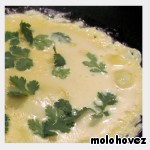 Замешаем любимое тесто для тонких блинов. Кинзу промоем, просушим бумажным полотенцем и оторвем листочки. Выливаем на сковороду порцию теста и сразу же, пока оно не "схватилось" с внешней стороны, распределяем на нем листочки кинзы. Готовые блины смажем сливочным маслом.