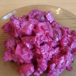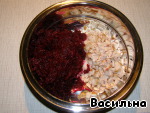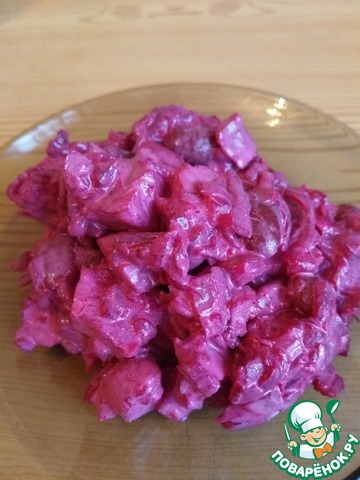 Вареную свеклу натереть на средней терке, добавить к курице. По объему свеклы должно быть в 1,5-2 раза больше курицы.
