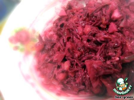 Салат у меня получился жидковатым. Но это из-за того, что свекла молодая, несколько водянистая. И хотя я ей отцеживала через дуршлаг, всё равно жидковато. Думаю, что с зимней свеклой будет лучше.