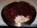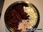 Из банки с фасолью слить жидкость, фасоль добавить к курице и свекле.