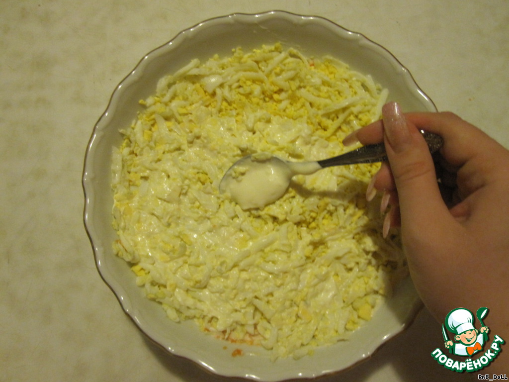 Далее выкладываем слой моркови. Смазываем майонезом.