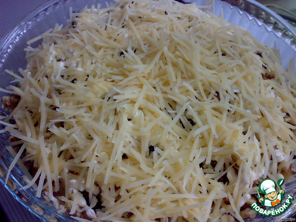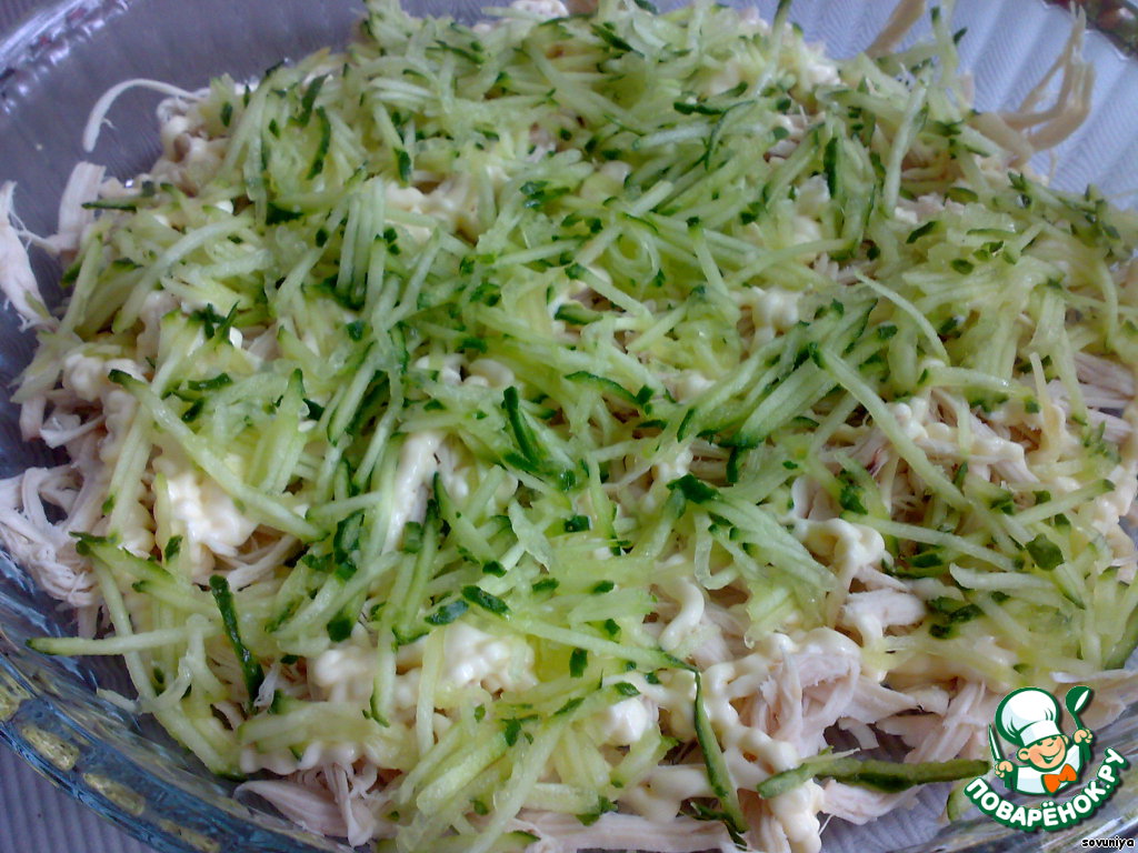 На дно салатника выложить куриное мясо, разделённое на волокна, и нанести сеточку из майонеза. Обычно я заменяю майонез на сметанный соус - на 200 г сметаны 1-2 ч.л. готовой горчицы, 2 ст.л. лимонного сока, 1 ч.л. жидкого мёда, перец чёрный молотый по вкусу. Но сегодня специально для мужа (завтра запланирован поход в магазин) заправила майонезом!