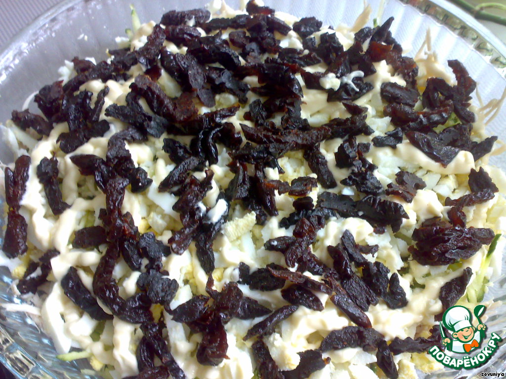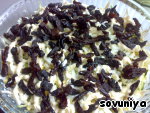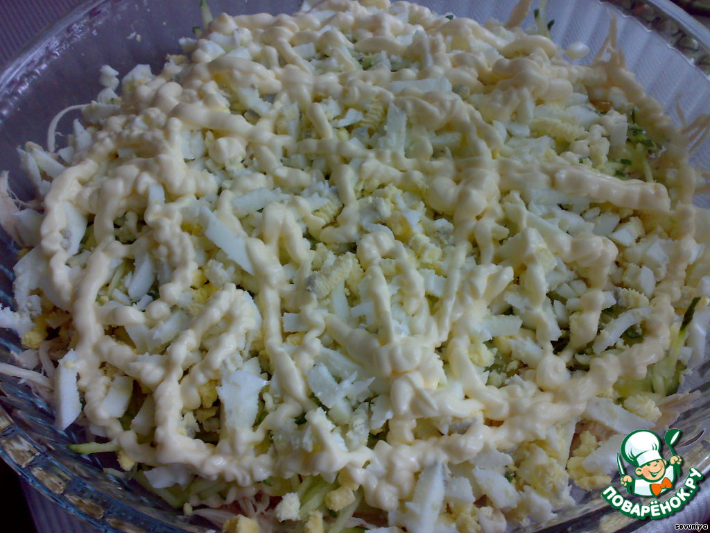 Следующий слой - яйца, нарезанные не очень мелко и всё та же сеточка из майонеза. А вот "сеточка из майонеза" - это принципиально - так салат получается воздушным, да и майонеза в салат меньше попадает